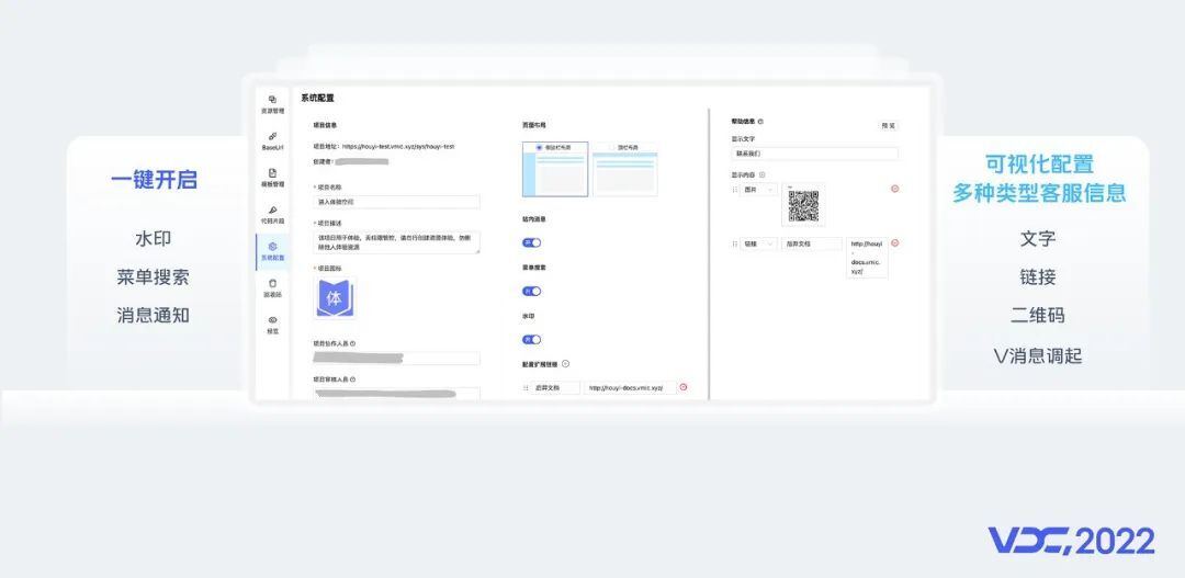 系统功能上我们提供了一键开启常用的水印、菜单搜索、消息通知等功能,还可以配置多种类型客服信息,方便系统级的版本发布通知及日常的值班人员维护。