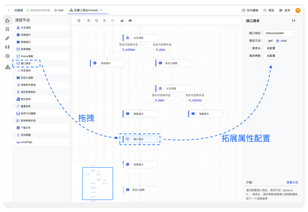 动态交互同样支持可视化配置,流程的运转逻辑清晰的展示在画布上,直观又容易维护。