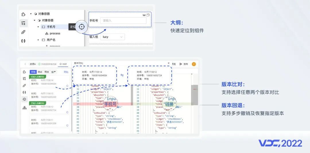 开发或迭代时,对页面的改动无法追溯也是一个痛点,于是我们内置了版本比对,只需拖拽任意两个版本到比对框,就可以实现两者的精确比对,方便排查问题;每个版本也提供了版本快速回退,点击即可一键回退。