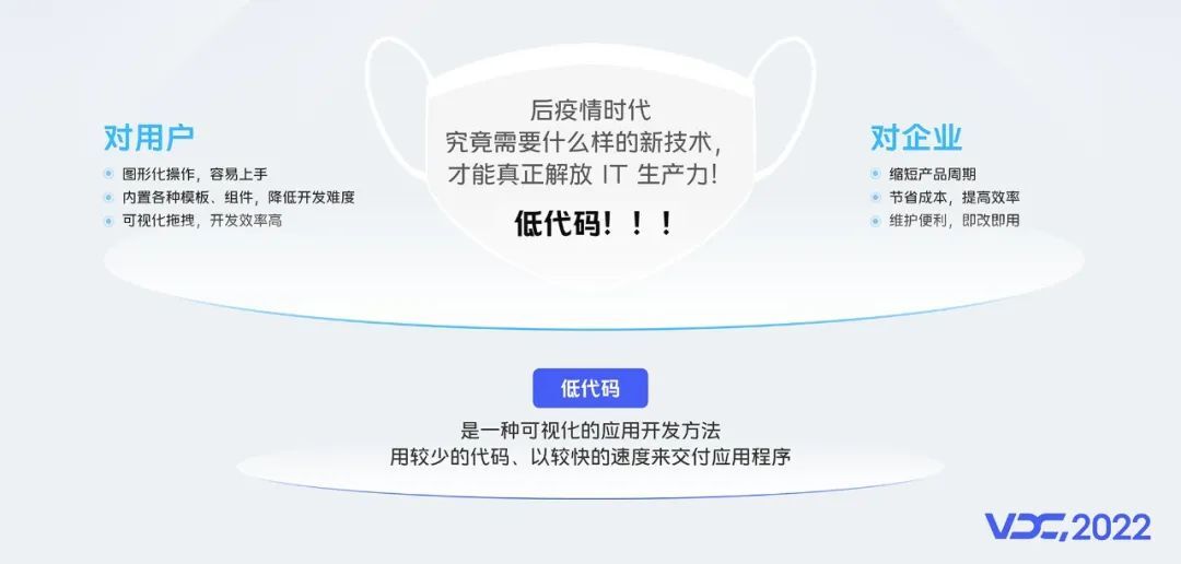 青春才几年,疫情占三年,后疫情时代,究竟需要什么样的新技术,才能真正解放IT生产力,我认为是低代码,一种可视化的应用开发方法,即“用较少的代码、以较快的速度来交付应用程序”。