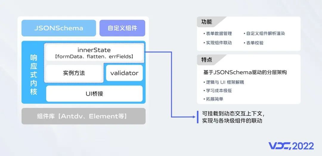 众所周知,表单场景一直都是前端中后台领域最复杂的场景,通过自研的表单渲染引擎我们提供了表单数据管理、表单状态管理、动态渲染、组件联动等功能;基于JSONSchema驱动的分层架构,实现了逻辑与UI框架解耦;通常,用户只需要稍微了解几个胶水层的API便可以快速上手;复杂的场景下,用户还可以通过拓展组件属性或开发自定义组件的方式来满足需求;另外,我们还将表单实例挂载到了动态交互的上下文,这样我们就可以很轻松的实现各块级组件联动和数据交互。