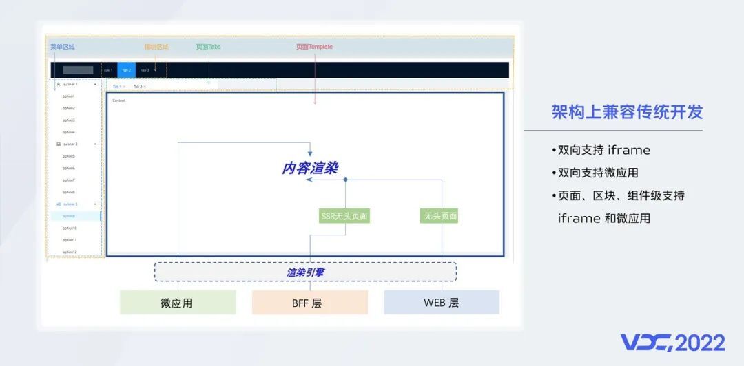一方面我们不断的丰富场景模型,提高拓展能力和配置效率;另一方面则从底层架构设计上兼容了传统的定制化开发;我们双向支持iframe及微应用,双向意味着后羿产出的页面可以嵌入到第三方应用中,也接受第三方应用嵌入到后羿中;并且支持页面级、区块级和组件级的嵌入。