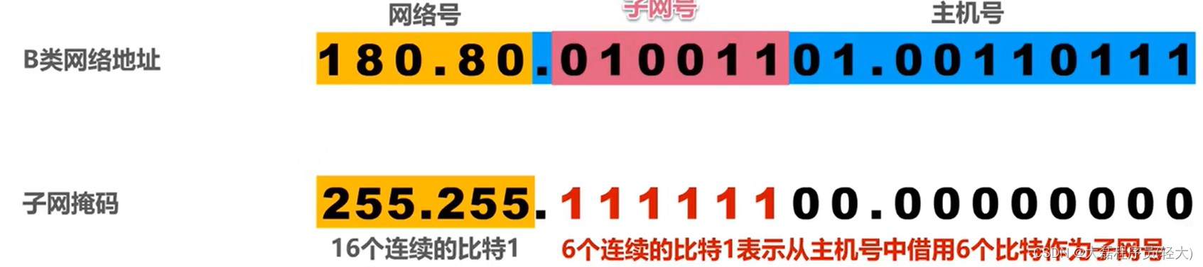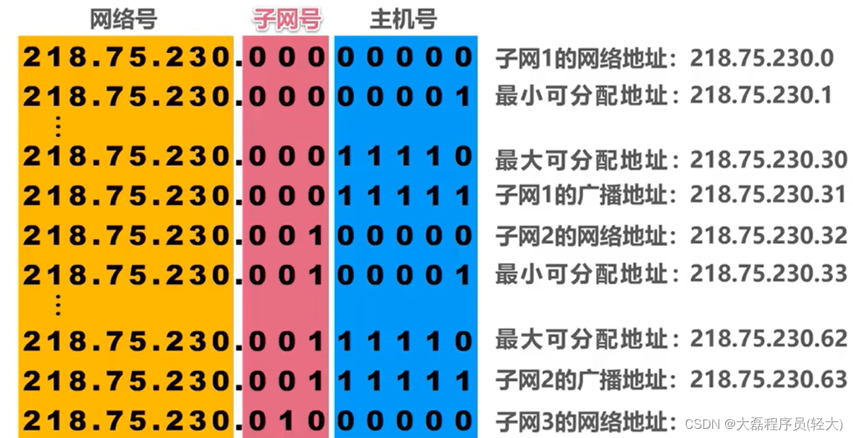 个子网,其中n是从主机号部分借用的用来作为子网号的比特数量。每个子网所分配的IP数量相同,例如图中的网络5只需要4个IP地址 ,但是我们给它分配了32个IP地址,这样就造成了IP地址的严重浪费。