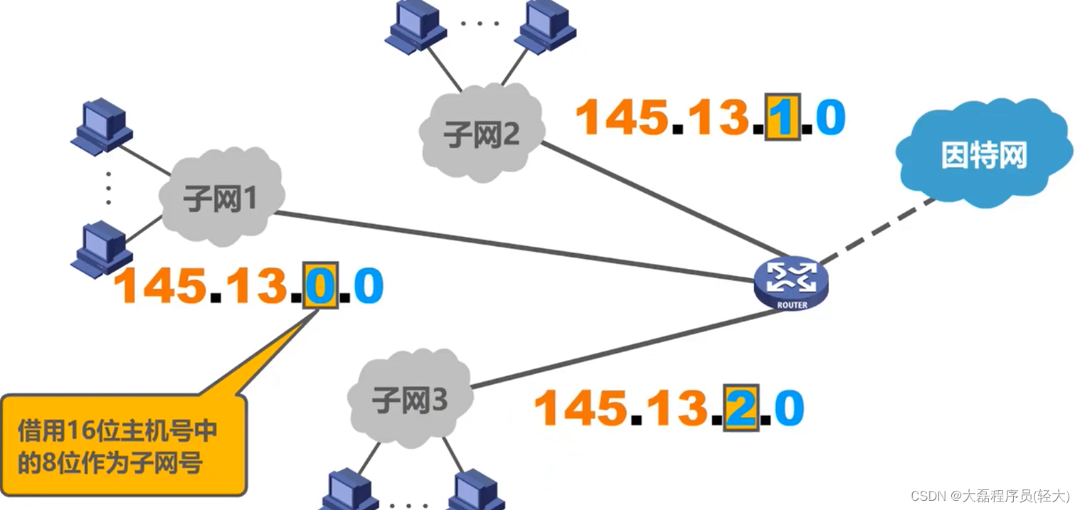 为避免这种情况出现,可以从主机号部分借用一部分作为子网号,如图