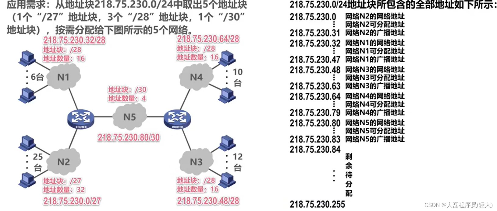 得出应用需求:从地址块218.75.230.0/24中取出5个地址块(1个“/27”地址块,3个“/28”地址块,1个“/30”地址块),按需分配给下图所示5个网络