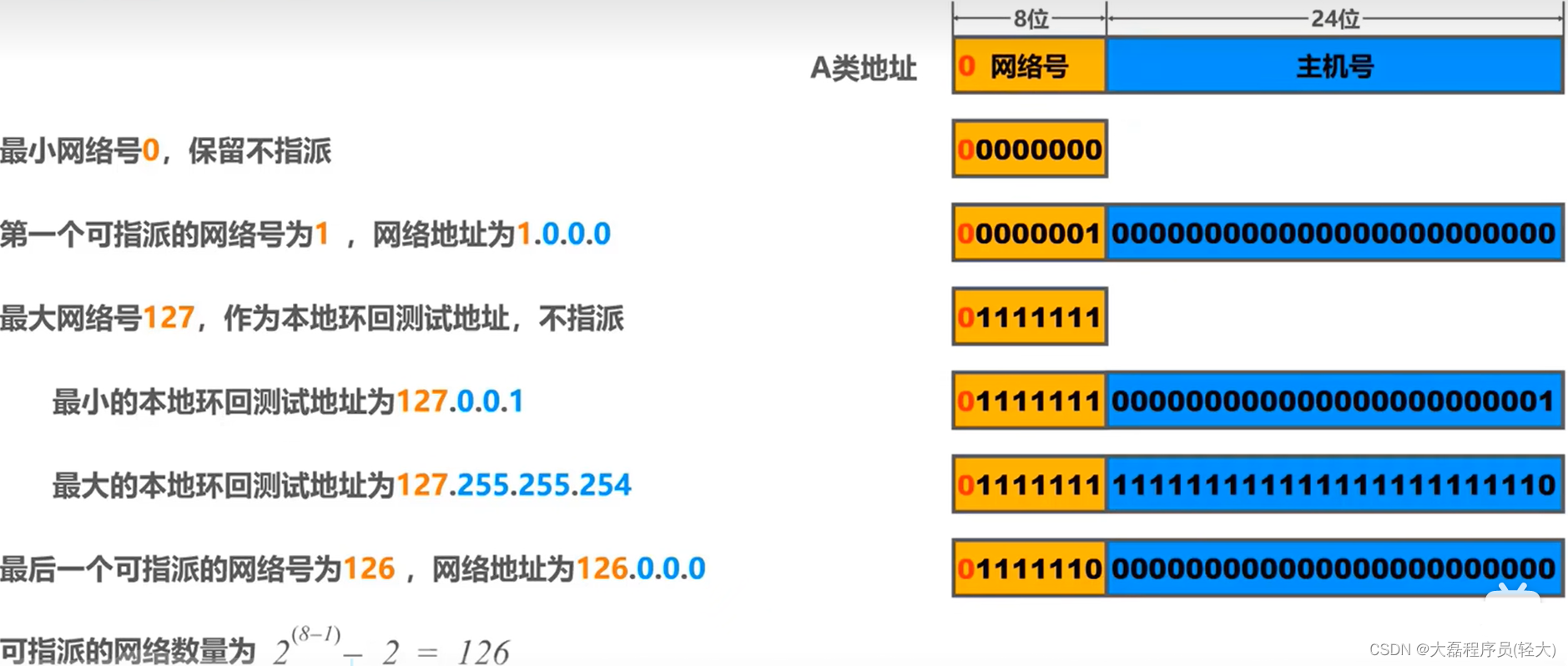 -2=126 (减2的原因是除去最小网络号0和最大网络号127)