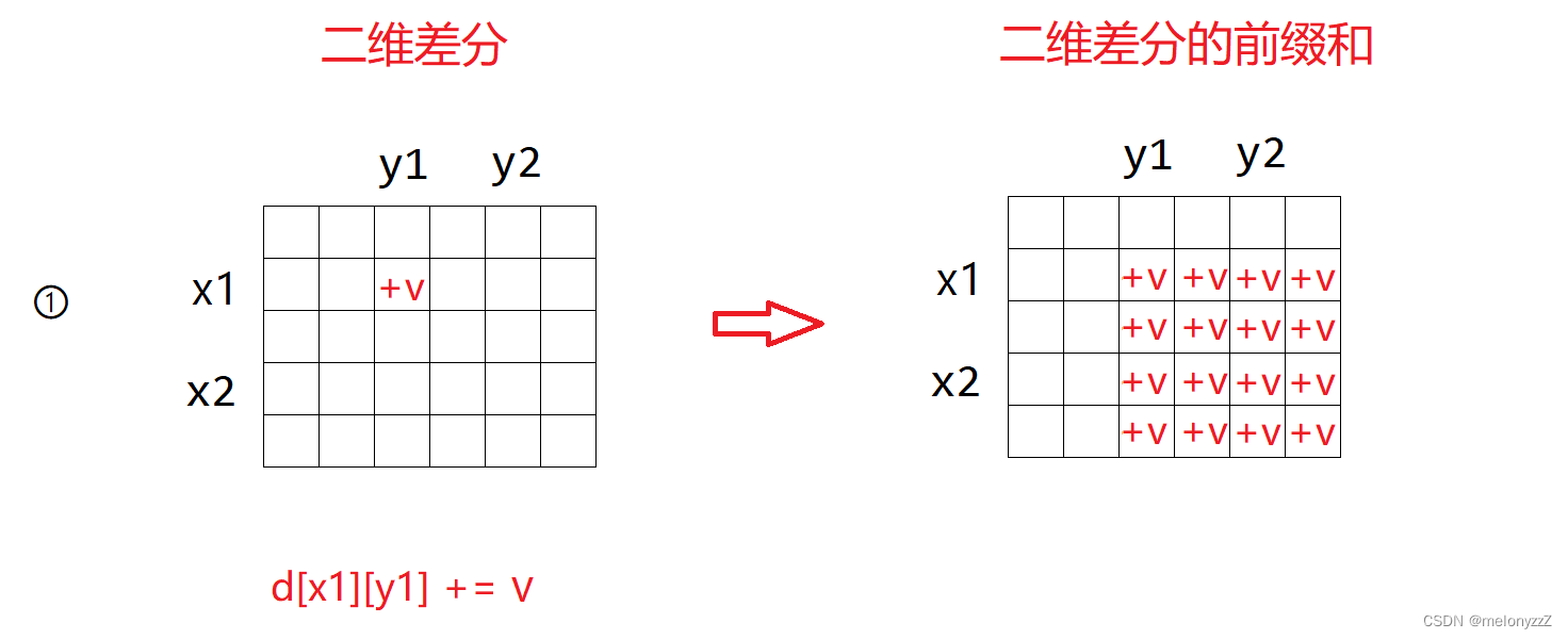 假设区块左上角坐标为 (x1, y1),右下角坐标为 (x2, y2),对该区块中的每个元素都加上 v 等价于下面四个操作:
