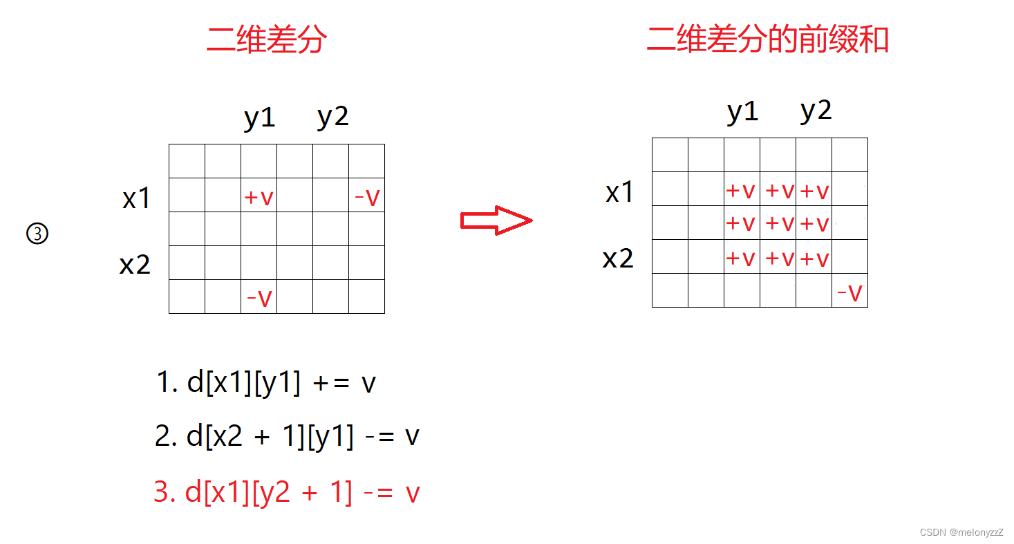 二维差分的主要用处:快速地将一个区块中的所有元素都加上一个值 v。