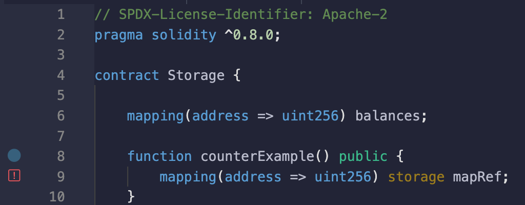 让我们用一个简单的合约作为例子来更好地理解。这个合约在存储中持有一个结构体的映射。为了比较每个数据位置的行为,我们将使用不同的函数,使用不同的数据位置关键字。