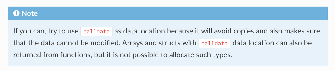 内存中(从而在之后不得不从内存中加载)。calldata是一个只读的数据位置,它可以确保数据不能被修改。这可能会增加安全性,特别是当传递给函数的参数代表 敏感 数据(例如64字节的签名)时。calldata在 Solidity 文档中确实被推荐: