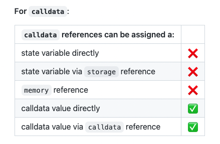 唯一的主要区别是,作为calldata引用的变量不能被修改,因为calldata是只读的。