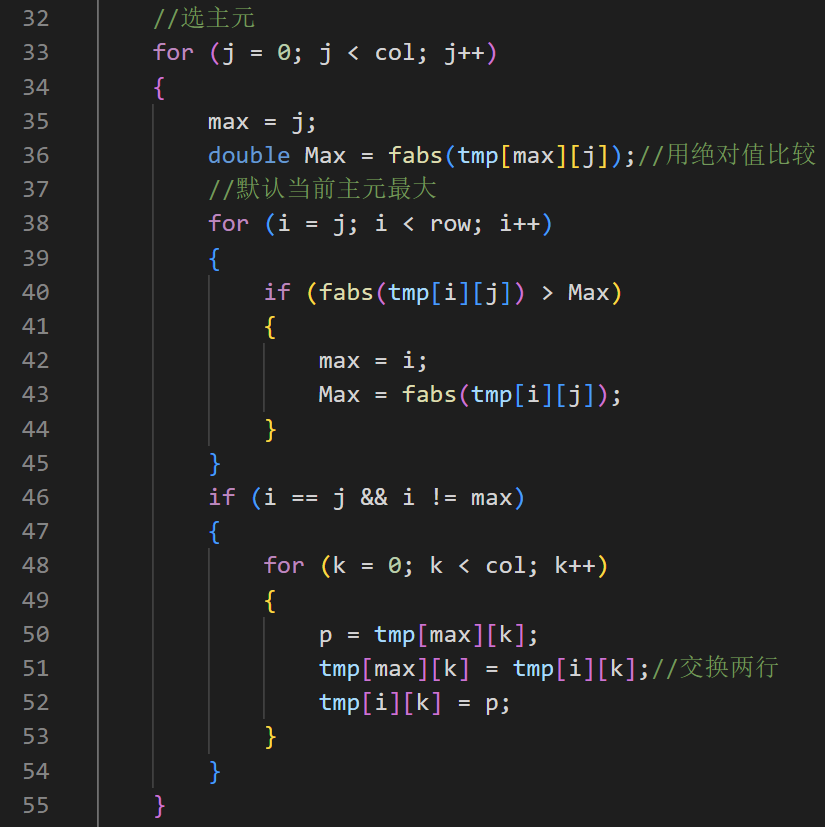 第33~55行:选择主元,默认当前主元最大,从主对角线下方选择主元(保护选过的主元)。