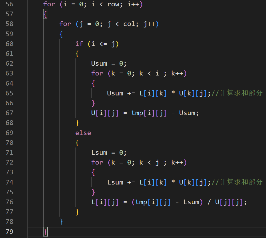 第60行:因为在计算LU时,是先计算U的行,再计算L的列,进行交替计算的;只需判断行号i和列号j的大小:i <= j 时,需要计算的元素在主对角线上方,计算U;反之,在主对角线下方计算L(因为L的主对角线为1无需计算,可以用主对角线作为分界线)