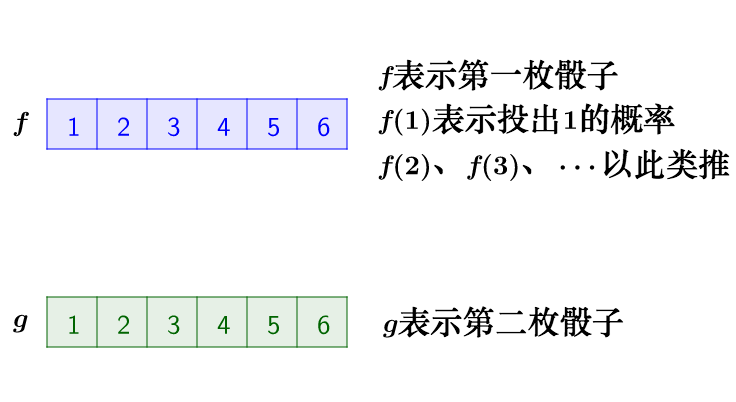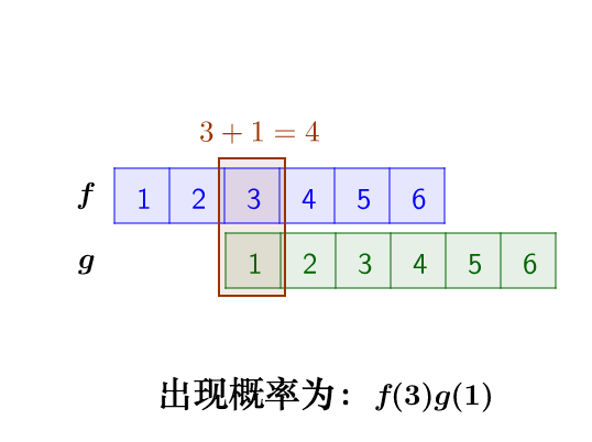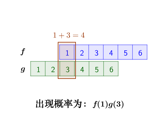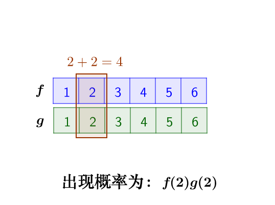问题的关键是,两个骰子加起来要等于4,这正是卷积的应用场景。我们把骰子各个点数出现的概率表示出来: