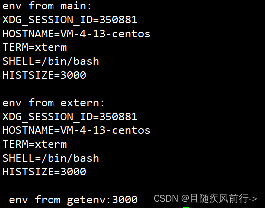 {printf("env from main:\n");for(int i=0;i<5;i++){printf("%s\n",env[i]);}printf("\n");extern char**environ;printf("env from extern:\n");for(int i=0;i<5;i++){printf("%s\n",environ[i]);}printf("\n env from getenv:%s\n",getenv("HISTSIZE"));return 0;