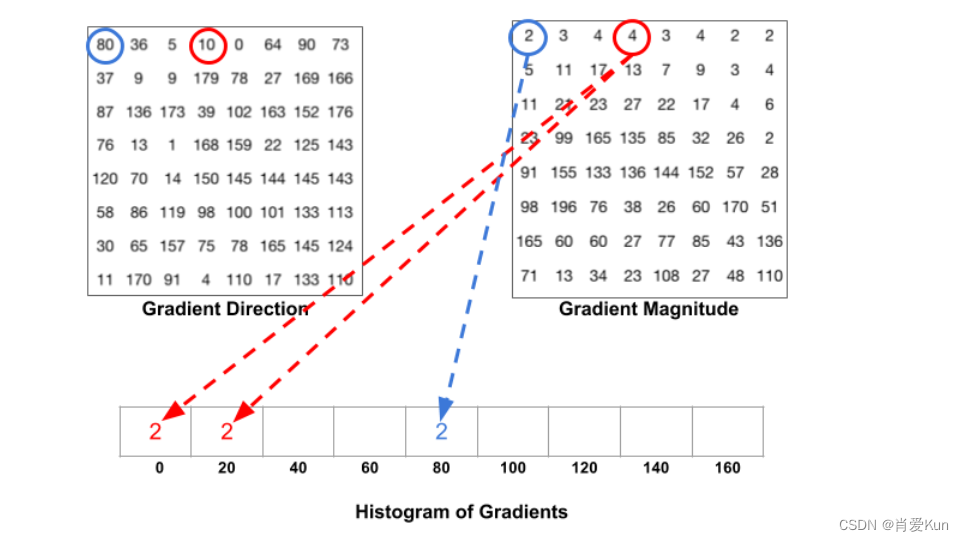 根据梯度幅值magnitude,梯度方向direction的两张表格,根据梯度方向direction选择bin的位置, 根据副值来确定这个bin的大小。蓝色圈的像素点对应的梯度方向direction为80,对应的幅值大小为2,与其对应的直方图第五个bin里面加2;对应的梯度方向direction为10,对应的幅值大小为4,因为角度10介于0-20度的中间(正好一半),所以把幅值一分为二按照比例影响大小放到0和20两个bin里面去。