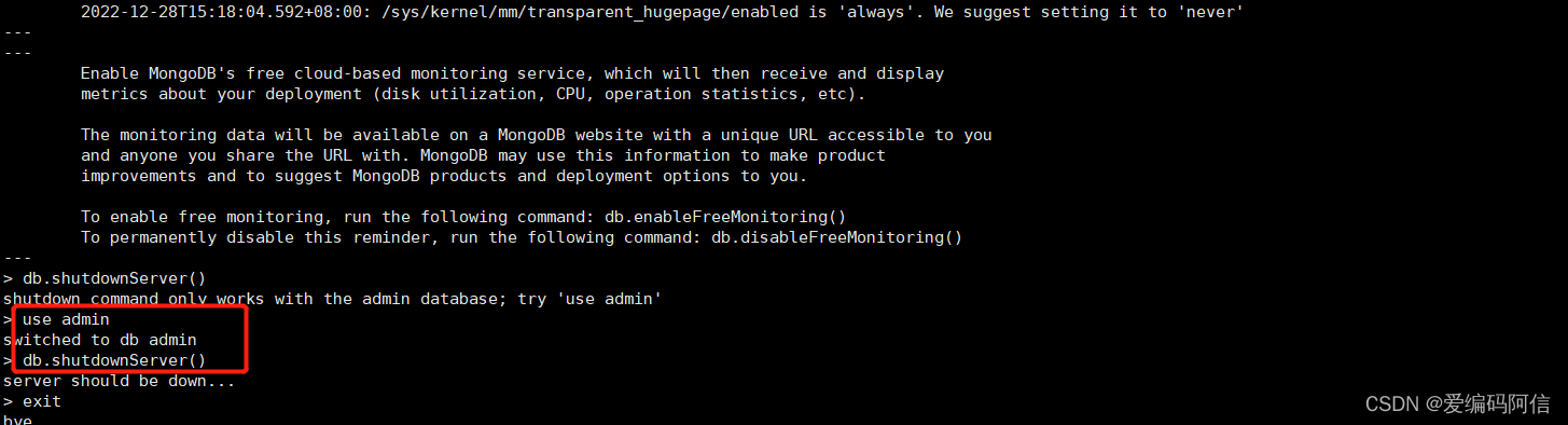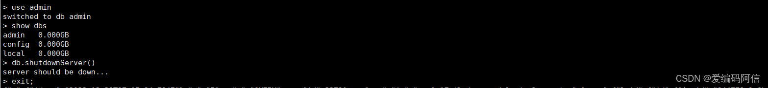 关闭方式二、进入mongodb使用下面的操作关闭