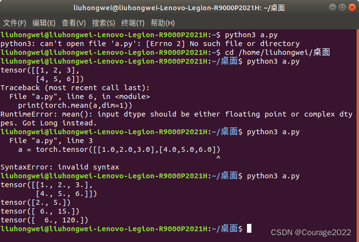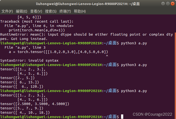 import torcha = torch.tensor([[1.0,2.0,3.0],[4.0,5.0,6.0]])print(a) print(torch.mean(a,dim=0)) print(torch.sum(a,dim=0)) print(torch.prod(a,dim=0))