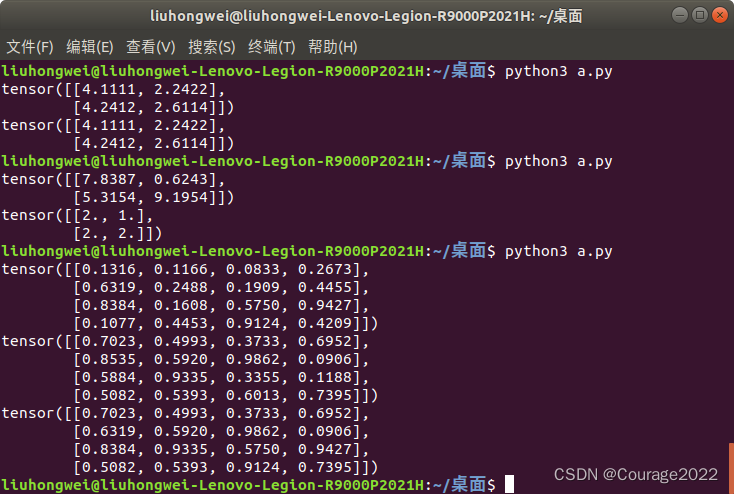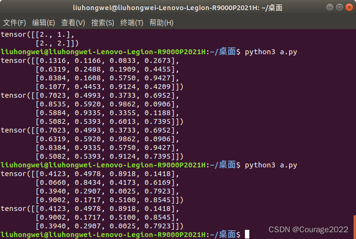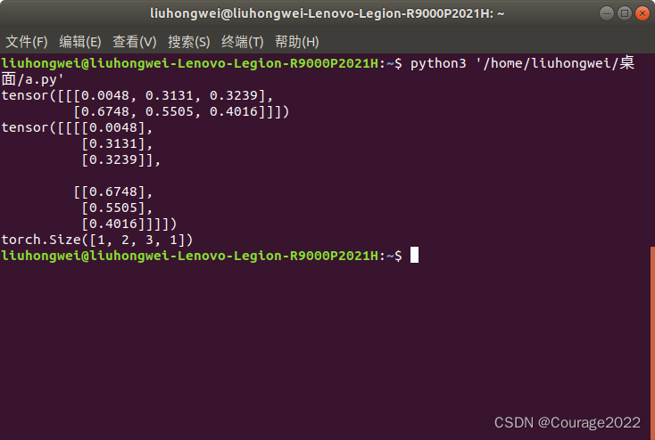 import torcha = torch.rand((1,2,3)) print(a)out = torch.squeeze(a) print(out) print(out.shape)