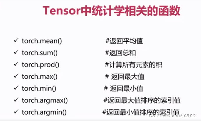import torcha = torch.tensor([[1.0,2.0,3.0],[4.0,5.0,6.0]])print(a) print(torch.mean(a,dim=1)) print(torch.sum(a,dim=1)) print(torch.prod(a,dim=1))