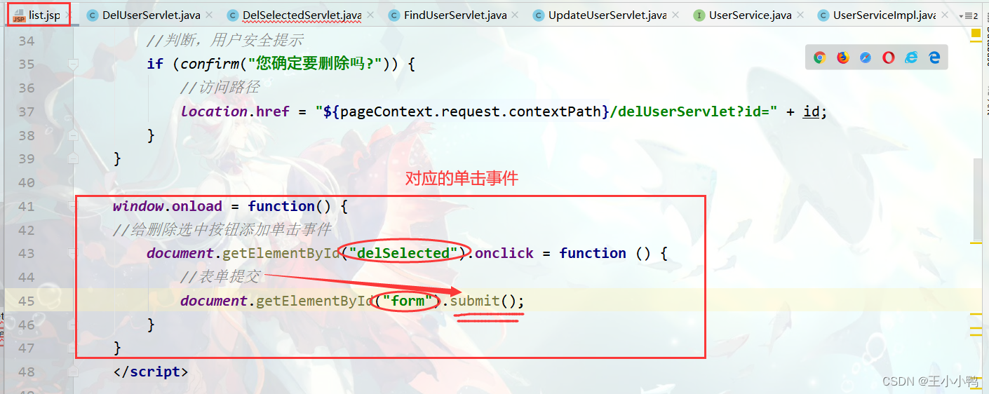 // 因为是根据id删除,不涉及汉字,可以不用设置编码// 1.获取id对象String id = request.getParameter("id"); // 2.调用service删除UserService service = new UserServiceImpl();service.deleteUser(id); //3.跳转查询所有servleresponse.sendRedirect(request.getContextPath()+"/userListServlet");测试: