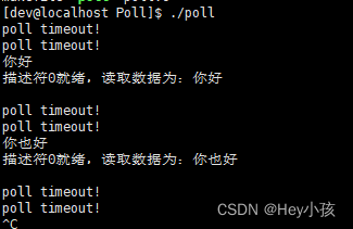 #includeint main() {struct pollfd pfds[10];int poll_count = 0;pfds[0].fd = 0;//设置要监控的描述符是标准输入pfds[0].events = POLLIN;//针对标准输入要监控的是可读事件poll_count++;while (1) {int ret = poll(pfds, 1, 3000);if (ret < 0) {perror("poll error!");usleep(1000);continue;}else if (ret == 0) {printf("poll timeout!\n");usleep(1000);continue;}for (int i = 0; i < poll_count; ++i) {if (pfds[i].revents & POLLIN) {//就绪了可读事件char buf[1024] = {0};read(pfds[i].fd, buf, 1023);printf("描述符%d就绪,读取数据为:%s\n", pfds[i].fd, buf);}else if (pfds[i].revents & POLLOUT) {//就绪的是可写事件,对应操作}}}return 0;