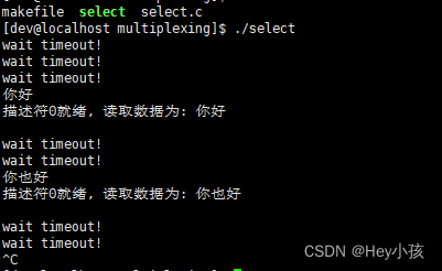 //#includeint main() {fd_set rfds;//1.初始化集合FD_ZERO(&rfds);while (1) {struct timeval tv;tv.tv_usec = 0;tv.tv_sec = 3;//设置超时时间为3s//2.将标准输入描述符添加到集合中FD_SET(0, &rfds);//0是标准输入描述符int max_fd = 0;//因为select会修改rfds集合(返回前会将未就绪的描述符剔除),所以需要在循环内每次添加int ret = select(max_fd + 1, &rfds, NULL, NULL, &tv);if (ret < 0) {perror("select error!\n");usleep(1000);continue;}else if (ret == 0) {//没有描述符就绪printf("wait timeout!\n");usleep(1000);continue;}//有描述符就绪for (int i = 0; i <= max_fd; ++i) {if (FD_ISSET(i, &rfds)) {//若i在集合中,说明描述符i就绪char buf[1024] = {0};int res = read(i, buf, 1023);if (res < 0) {//接收数据出错perror("recv error!\n");FD_CLR(i, &rfds);return -1;}printf("描述符%d就绪, 读取数据为: %s\n", i, buf);}}}return 0;