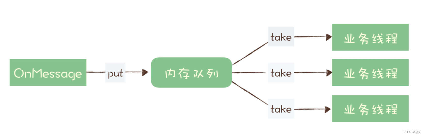 它收消息处理的业务逻辑可能比较慢,也很难再优化了,为了避免消息积压,在收到消息的OnMessage方法中,不处理任何业务逻辑,把这个消息放到一个内存队列里面就返回了。