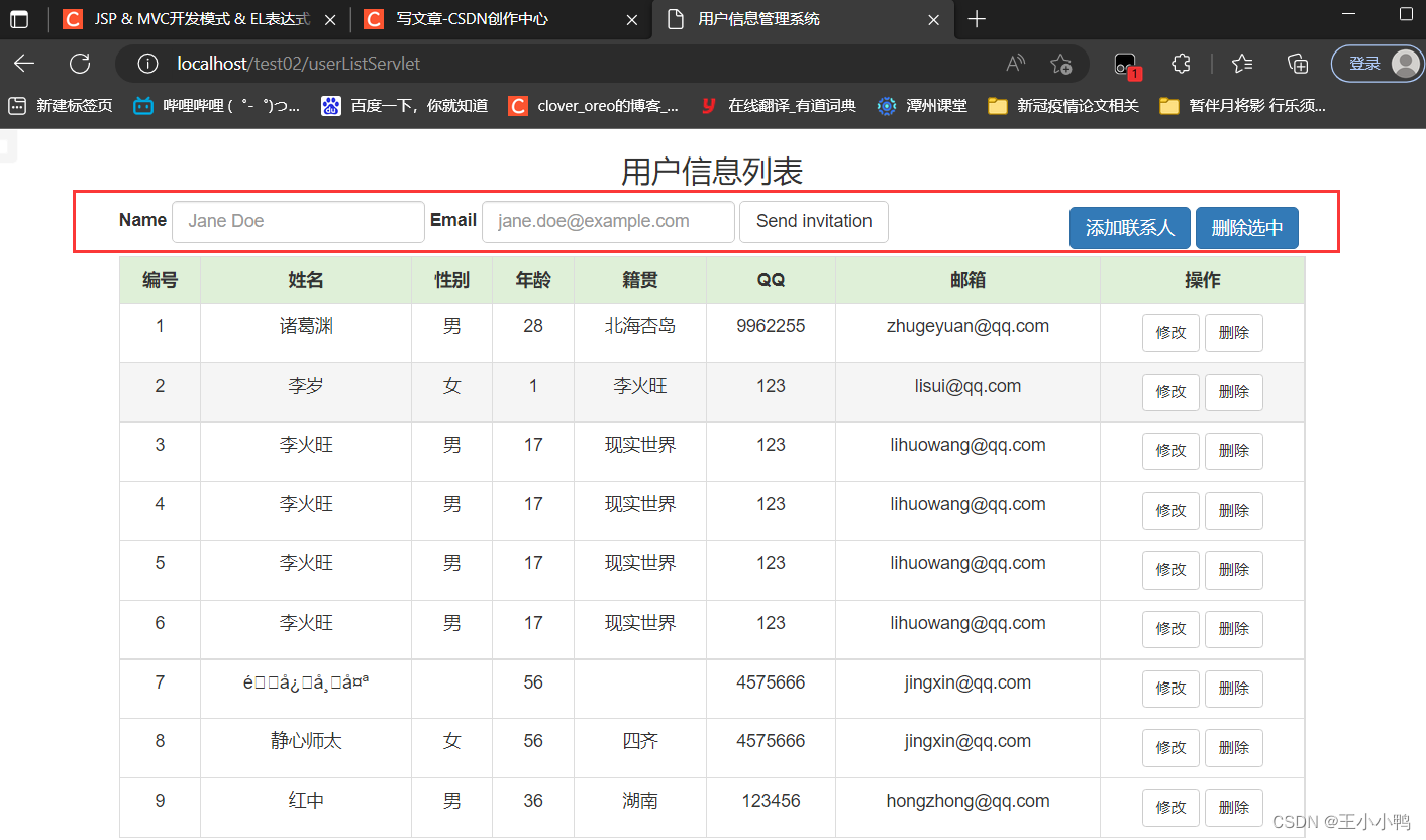 //1.设置编码request.setCharacterEncoding("utf-8");//2.获取参数Mapmap = request.getParameterMap();//3.封装对象User user = new User();try {BeanUtils.populate(user,map);} catch (IllegalAccessException e) {e.printStackTrace();} catch (InvocationTargetException e) {e.printStackTrace();}//4.调用service方法报错UserService service = new UserServiceImpl();service.addUser(user);//5.跳转到/userListServlet // 没有共享数据使用重定向 加上虚拟路径request.getContextPath()response.sendRedirect(request.getContextPath()+"/userListServlet"); UserDaoImpl中的addUser方法也优化了@Overridepublic User addUser(User user) {try {//第一版 //String sql = "insert into user2 set name = ?, gender = ?, age = ?, address = ?, qq= ?, email = ?";//第二版String sql ="insert into user2 values(null, ?, ?, ?, ?, ?, ?,null, null )";template.update(sql, user.getName(), user.getGender(), user.getAge(), user.getAddress(), user.getQq(), user.getEmail());} catch (DataAccessException e) {e.printStackTrace();}return user;}添加用户成功!
