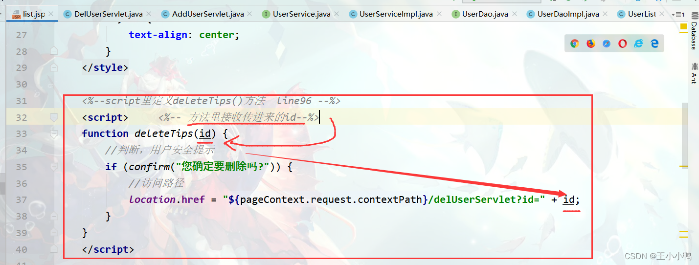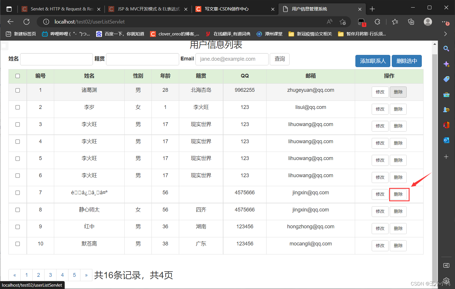 // 因为是根据id删除,不涉及汉字,可以不用设置编码// 1.获取id对象String id = request.getParameter("id"); // 2.调用service删除UserService service = new UserServiceImpl();service.deleteUser(id); //3.跳转查询所有servleresponse.sendRedirect(request.getContextPath()+"/userListServlet");测试: