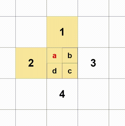def get_near_points(self, x, y, i, j):sub_x = x - isub_y = y - jif sub_x > 0.5 and sub_y > 0.5:return [[0, 0], [1, 0], [0, 1]]elif sub_x < 0.5 and sub_y > 0.5:return [[0, 0], [-1, 0], [0, 1]]elif sub_x < 0.5 and sub_y < 0.5:return [[0, 0], [-1, 0], [0, -1]]else:return [[0, 0], [1, 0], [0, -1]]