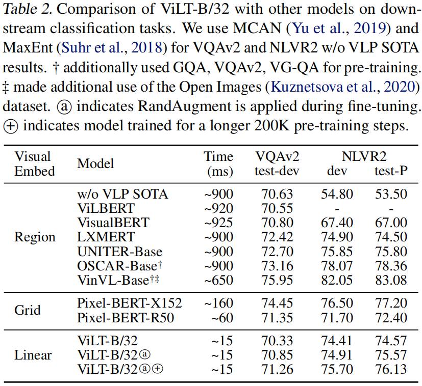 我们在两个常用的数据集上评估了 ViLT-B/32:VQAv2 和 NLVR2。我们使用一个隐层大小为 1536 的两层 MLP 作为微调的下游头部。
