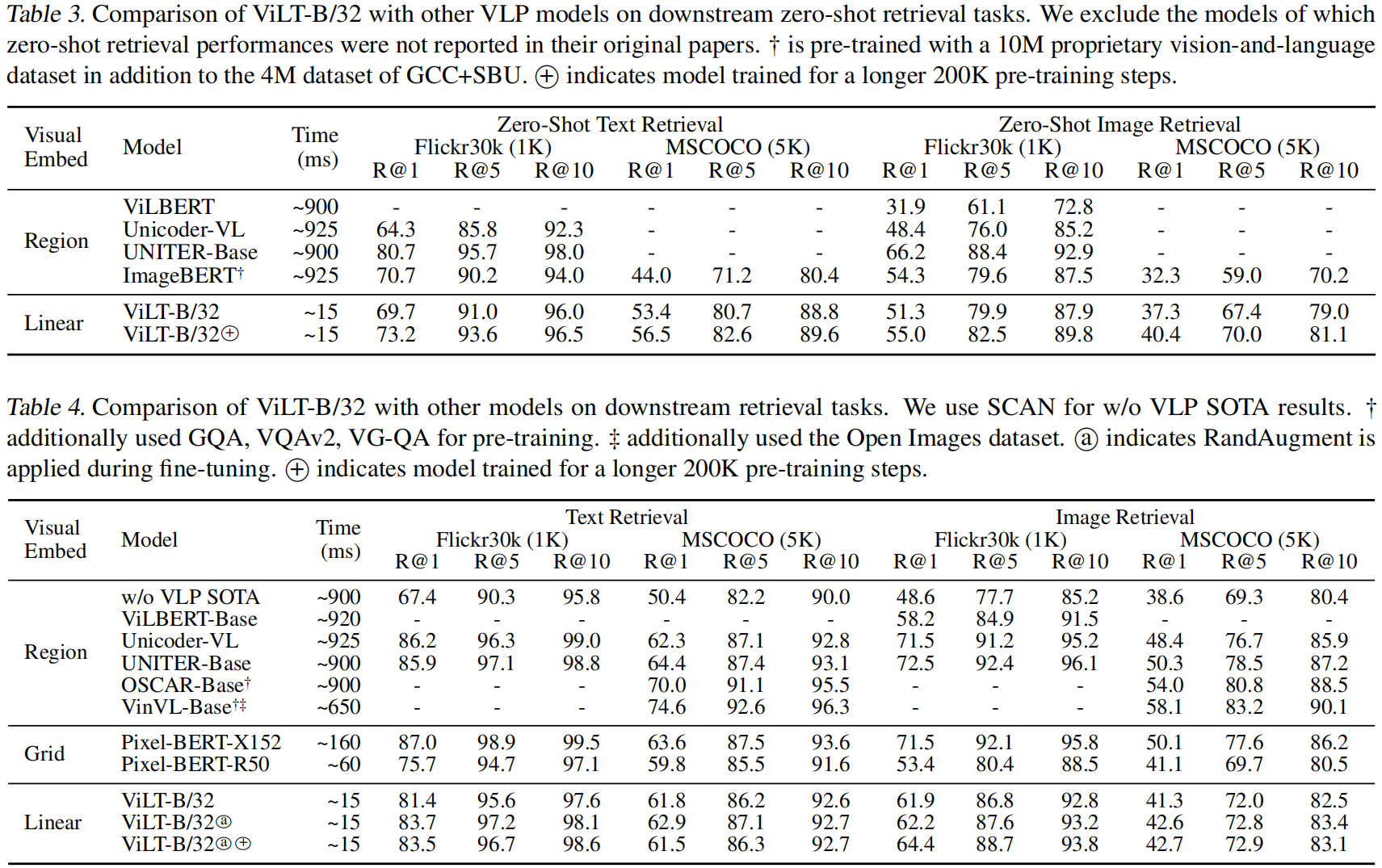 表 2 展示了结果。考虑到其显著的推理速度,ViLT-B/32 在两个数据集上都保持了竞争性能。