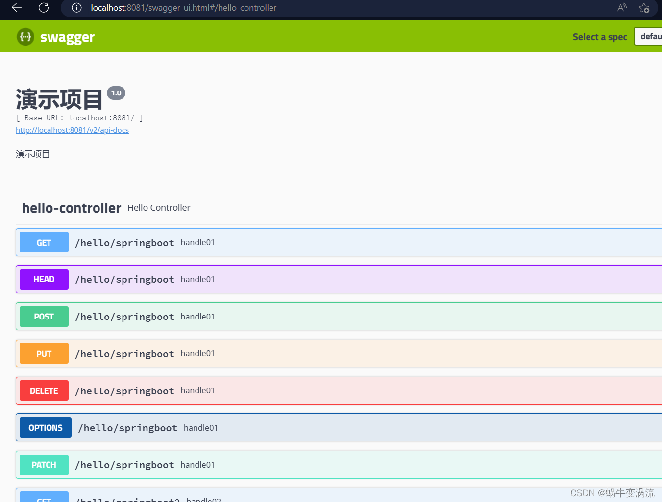 public class Swagger2Config {@Beanpublic Docket createRestApi(){return new Docket(DocumentationType.SWAGGER_2).apiInfo(apiInfo()).select().apis(RequestHandlerSelectors.basePackage("com")).paths(PathSelectors.any()).build();}private ApiInfo apiInfo(){return new ApiInfoBuilder().title("演示项目API").description("演示项目").version("1.0").build();}