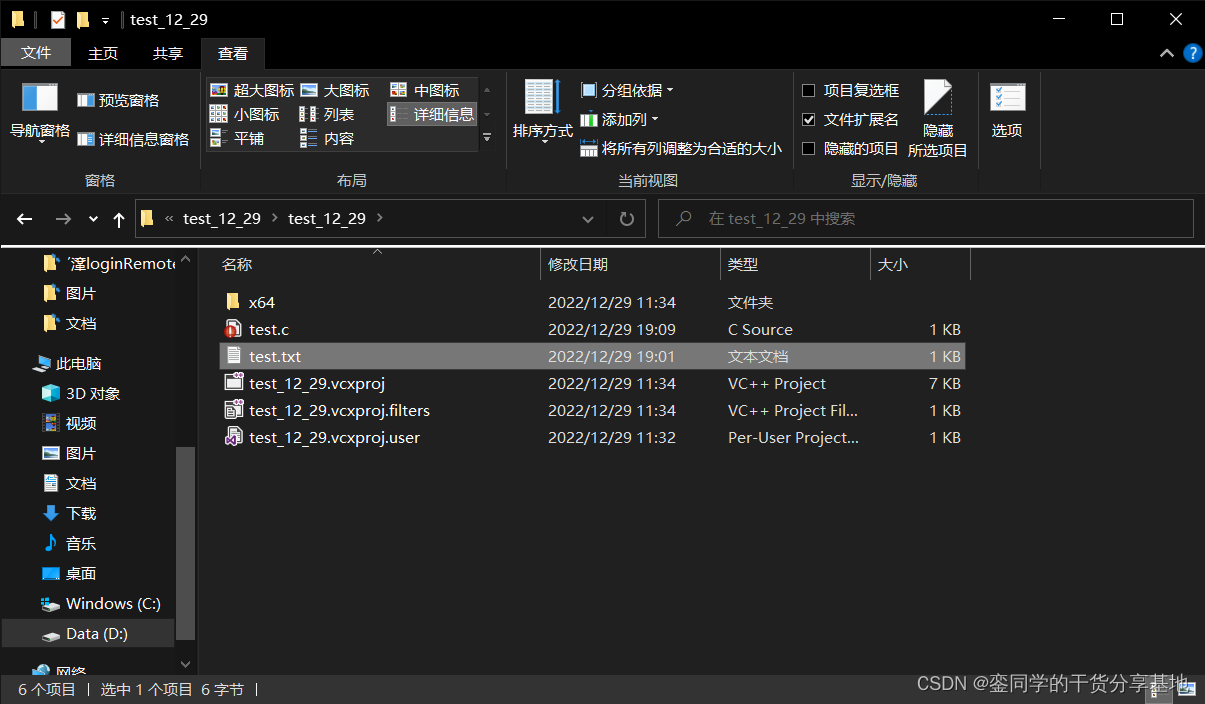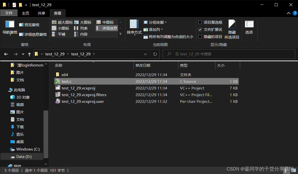 因为我们在打开文件时没有特意注明路径,则默认路径为 .c 文件的同目录下。为了验证我们代码的正确性,我们在该目录下创建“ test.c ”文件用于代码测试: