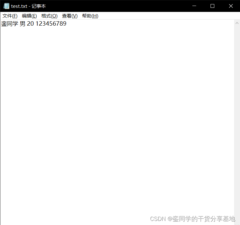 {FILE* p = fopen("test.txt", "w");//文件打开模式为“写”if (p == NULL){perror("FILE_OPEN");return 1;}con c1 = { "銮同学","男",20,"123456789" };fprintf(p, "%s %s %d %s\n", c1.name, c1.sex, c1.age, c1.tele);//按照"%s %s %d %s\n"的格式将数据c1.name, c1.sex, c1.age, c1.tele写入至p所指向的文件内fclose(p);p = NULL;return 0;