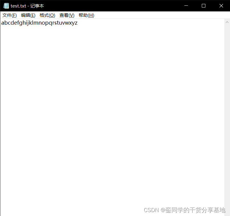 {FILE* p = fopen("test.txt", "w");//文件打开模式为“写”if (p == NULL){perror("FILEOPEN");return 1;}char ch = 'a';for (ch = 'a'; ch <= 'z'; ch++){fputc(ch, p);//使用 fputc 函数顺序写入小写字符a~z}free(p);p = NULL;return 0;