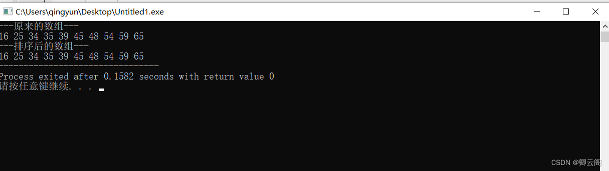 #include/*注意形参的形式,加[],表明mystr是一个存放地址的变量,这个地址所在空间存放的是char型的数据*/ int sort(int a[],int len) {int i,j,temp;for(i=0;i a[j+1]){temp=a[j];a[j]=a[j+1];a[j+1]=temp;}} } int main(void) {int arr[10]={45,65,34,35,25,39,54,59,16,48};int i;sort(arr,10);printf("---原来的数组---\n"); for(i=0;i<10;i++)printf("%d ",arr[i]);putchar('\n');printf("---排序后的数组---\n"); for(i=0;i<10;i++)printf("%d ",arr[i]);return 0; }