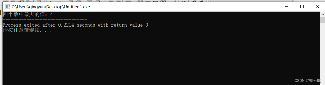 #includeint max1(int a,int b) {return a>b?a:b; } int max2(int a,int b,int c,int d) {int m;m=max1(a,b);m=max1(m,c);m=max1(m,d);return m; } int main() {int ma;ma=max2(1,2,3,4);printf("四个数中最大的值:%d",ma); return 0; }