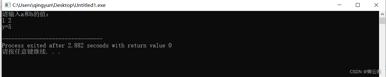 #includeint yum(int x,int y) {return x*x+y*y; //条件表达式求出x和y的最大值,用return 返回。 } int main(void) {int y;int a,b,c;printf("请输入a和b的值:\n");scanf("%d%d",&a,&b);c=yum(a,b); //再次调用函数max,a、b为实参。printf("y=%d\n",c); return 0; }