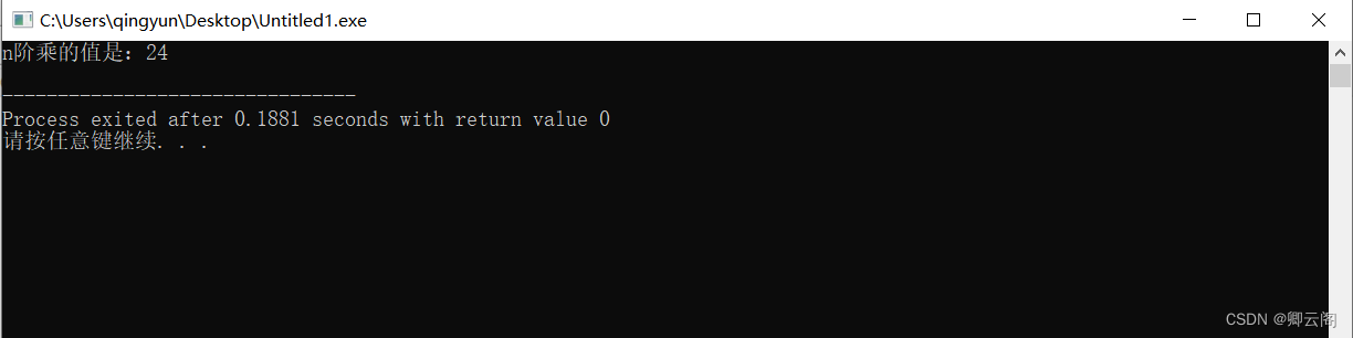 #includeint fac(int n) { if(1==n)return 1;//基础解 fac1=fac(n-1);//划分子问题 if(n!=1)return fac1*n;//用子问题解决主问题 } int main() {int n=4;printf("n阶乘的值是:%d\n", fac(n)); return 0; }