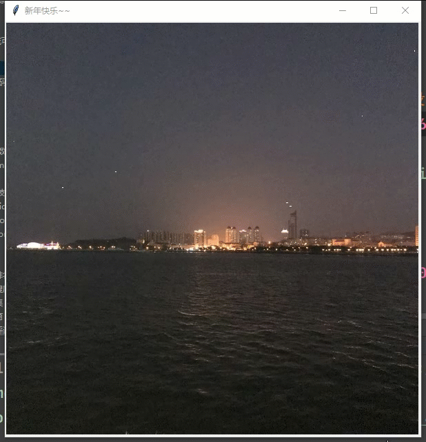 def simulate(cv):t = time()#返回自1970年后经过的浮点秒数,精确到小数点后7位explode_points = []#爆炸点列表,烟花列表wait_time = randint(10,100)#等待时间为10到100之间整数numb_explode = randint(8,20)#爆炸烟花个数时6到10之间的随机整数# create list of list of all particles in all simultaneous explosionfor point in range(numb_explode):#为所有模拟烟花绽放的全部粒子创建一列列表if point<=4:objects = []#每个点的爆炸粒子列表粒子列表x_cordi = 250 + point*50#每个爆炸点的x轴y_cordi = 100#每个爆炸点的y轴speed = uniform (0.5, 2.5)#每个爆炸点的速度size = uniform (0.5,3)#每个爆炸点的大小color = choice(colors)#每个爆炸点的颜色explosion_speed = uniform(0.6, 3)#爆炸的绽放速度total_particles = randint(10,60)#烟花的总粒子数for i in range(1,total_particles):#同一个烟花爆炸出来的粒子大小、速度、坐标都是相同的r = part(cv, idx = i, total = total_particles, explosion_speed = explosion_speed, x = x_cordi, y = y_cordi, vx = speed, vy = speed, color=color, size = size, lifespan = uniform(0.6,1.75))#把上述参数代入part函数,但是每个粒子的生存时间是自己独立的objects.append(r)#把r添加进粒子列表explode_points.append(objects)#把粒子列表添加进烟花列表else: objects = []#每个点的爆炸粒子列表粒子列表x_cordi = randint(50,550)#每个爆炸点的x轴y_cordi = randint(50, 250)#每个爆炸点的y轴speed = uniform (0.5, 2.5)#每个爆炸点的速度size = uniform (0.5,3)#每个爆炸点的大小color = choice(colors)#每个爆炸点的颜色explosion_speed = uniform(0.3, 2)#爆炸的绽放速度total_particles = randint(10,50)#烟花的总粒子数for i in range(1,total_particles):#同一个烟花爆炸出来的粒子大小、速度、坐标都是相同的r = part(cv, idx = i, total = total_particles, explosion_speed = explosion_speed, x = x_cordi, y = y_cordi, vx = speed, vy = speed, color=color, size = size, lifespan = uniform(0.6,1.75))#把上述参数代入part函数,但是每个粒子的生存时间是自己独立的objects.append(r)#把r添加进粒子列表explode_points.append(objects)#把粒子列表添加进烟花列表total_time = .0#初始化总时间# keeps undate within a timeframe of 1.8 second while total_time < 2:#当总时间小于1.8秒时运行该循环sleep(0.03)#让画面暂停0.01秒tnew = time()#刷新时间t, dt = tnew, tnew - t#时间等于新时间,和上次时间间隔为tnew-tfor point in explode_points:#遍历烟花列表for item in point:#遍历烟花里的粒子列表item.update(dt)#粒子更新时间cv.update()#刷新画布total_time += dt#为while循环增加时间root.after(wait_time, simulate, cv)#将组件置于其他组件之后,放在最顶层,覆盖下面的,递归调用自己,形成新一轮的爆炸def close(*ignore):#打开模拟循环并关闭窗口"""Stops simulation loop and closes the window."""global rootroot.quit()if __name__ == '__main__': root = tk.Tk() root.title('新年快乐~~') # 设置窗体的标题栏cv = tk.Canvas(root, height=600, width=600)#绘制一个高600,宽600的画布 bgpath = filedialog.askopenfilename(title='请选择背景图片')#选择背景图片image = Image.open(bgpath)#打开背景图片image = image.resize((600,600), Image.ANTIALIAS)#把背景图片调整成窗口大小photo = ImageTk.PhotoImage(image) cv.create_image(0, 0, image=photo, anchor='nw')#在画布上绘制加载的背景图片 bgmusic = filedialog.askopenfilename(title='请选择背景音乐')py.mixer.init()# 初始化py.mixer.music.load(bgmusic)# 文件加载py.mixer.music.play(-1, 0, fade_ms=50)# 播放 第一个是播放值 -1代表循环播放, 第二个参数代表开始播放的时间py.mixer.music.pause() #暂停py.mixer.music.unpause()#取消暂停cv.pack()#把cv添加进去root.protocol("WM_DELETE_WINDOW", close)root.after(200, simulate, cv)#在0.1秒后再调用stimulate函数,生成一轮烟花绽放效果root.mainloop()#执行root,生成窗口