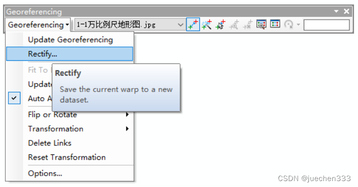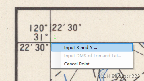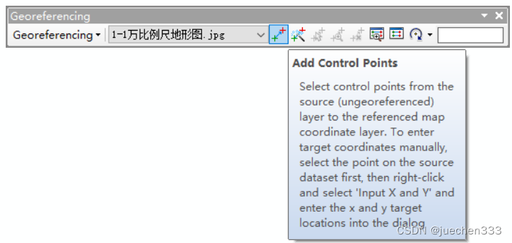 本例已经整平处理。注:若内图廓四边不水平或垂直,必须先将该图片整平后方能进行配准。确定好配准信息后,打开ArcMap,加载地形图图片数据。右击菜单栏空白处,添加【Georeferencing】工具条。首先,取消【Georeferencing】工具条下的【Auto Adjust】的勾选;其次,使用【Add Control Points】工具,对四角点进行配准;点击某一角点后,右击任意位置,选择【Input X and Y】,将步骤(2)中的对应高斯坐标输入最后,依次设置好四角点的连接关系。