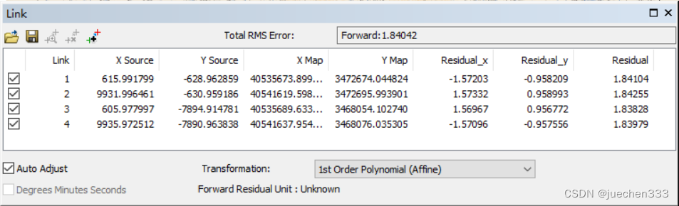 点击工具条中【View Link Table】按钮打开【Link】,表中列出了从像素坐标系(原始)到高斯坐标系(目标)的控制点对应关系,残差列表为空。