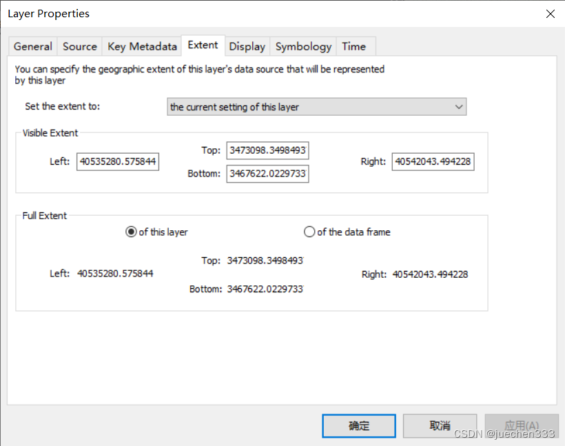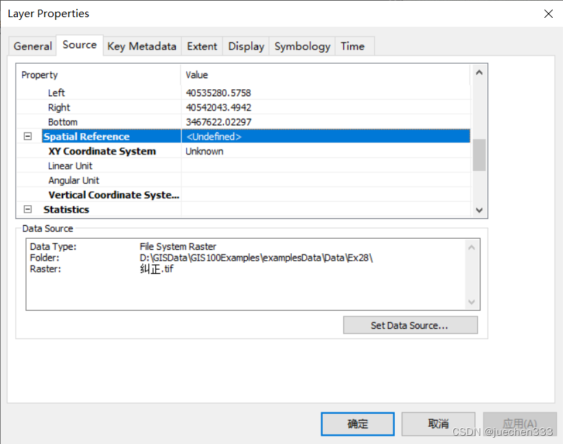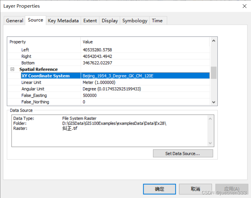 重新打开ArcMap,加载校正后的地形图文件“纠正.tif”,双击“纠正.tif”图层,点击【Extent】可以查看到该图层的坐标范围已校正到高斯坐标系下,点击【Source】可以查看坐标信息,但该数据只是隐式的具有坐标信息,需要进行定义投影后才具有显示坐标信息。打开【Data Management Tools】→【Projections and Transformations】→【Define Projection】对话框,【Input Dataset or Feature Class】设置为“纠正.tif”,点击右侧坐标系按钮,打开【Spatial Reference Properties】对话框;选择【Projected Coordinate Systems】→【Gauss Kruger】→【Beijing 1954】→【Beijing_1954_3_Degree_GK_CM_120E】。点击【OK】,执行定义投影工具,得到定义投影的地形图。