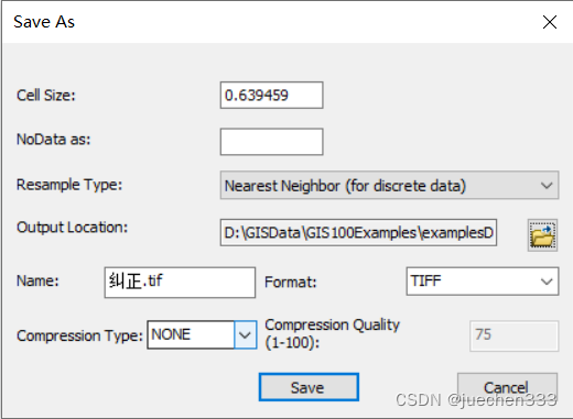 在【Link】对话框中,变换选择【Auto Adjust】或【1st Order Polynomial(Affine)】,即可计算出四角点校正前后产生的残差值。由于【Auto Adjust】是强制性变换方法,容易造成图片校正前后发生严重扭曲、错位等错误,不建议使用该方法;而一阶多项式或二阶多项式等变换方法是在牺牲校正精度的情况下,保持图像的整体完整性(无错位)。本例中,由于控制点为四角点,包含了全部图内容,可以考虑使用【Auto Adjust】方法。选择工具条【Georeferencing】下的【Rectify】工具,保存校正后的地形图为“纠正.tif”,【Output Locatin】为“Ex28”;【Format】为“TIFF”,【Cell Size】默认(以一阶多项式变换方法进行纠正)。