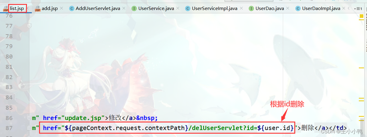 // 因为是根据id删除,不涉及汉字,可以不用设置编码// 1.获取id对象String id = request.getParameter("id"); // 2.调用service删除UserService service = new UserServiceImpl();service.deleteUser(id); //3.跳转查询所有servleresponse.sendRedirect(request.getContextPath()+"/userListServlet");测试: