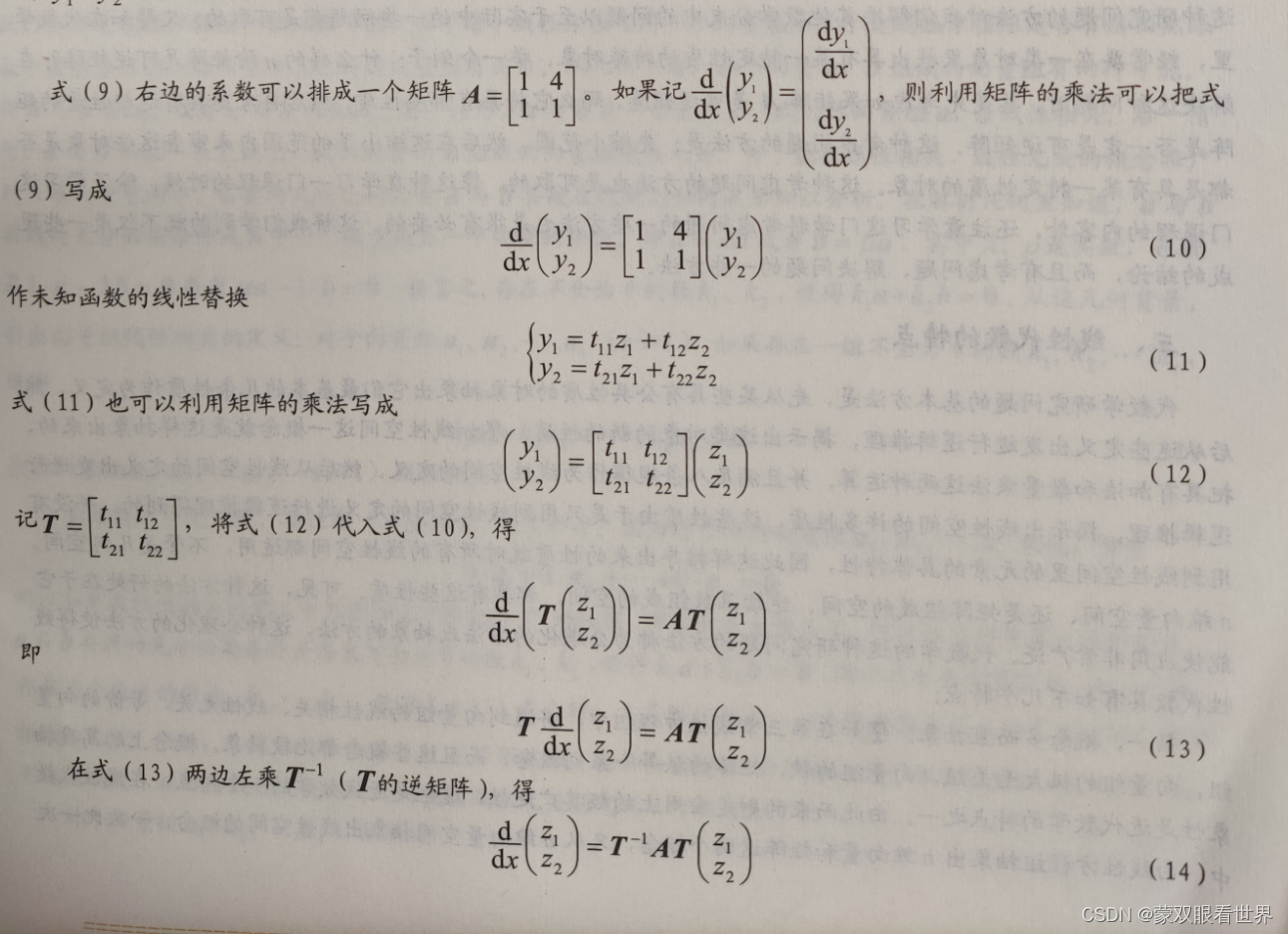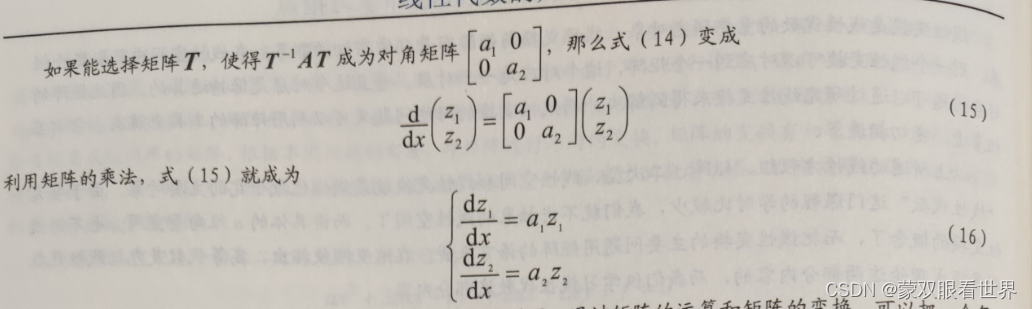 显然,微分方程组 (16)是很容易求解的。这个例子说明,通过矩阵的运算和矩阵的变换,可以把一个复杂的问题变成一个较简单的问题,所以矩阵是一个很有用的工具。