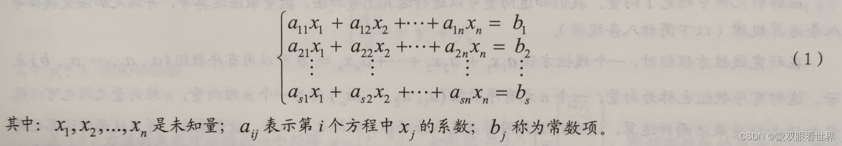 线性方程组(1)在什么时候有解?如何求解?解的结构如何?这就是线性代数要研究的第一个问题。在求解线性方程组时,行列式是一个重要的工具,所以先要研究行列式。线性方程组完全被它的全部系数和常数项所决定,至于未知量用什么符号表示是没有什么关系的。因此,线性方程组 (1)可以用下面: